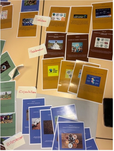 L’atelier du 6 octobre a été le premier moment participatif dans les classes. Les étudiants de troisième année en International Business ont été répartis en petits groupes et invités à mettre en lien les 48 cartes thématiques de la Fresque. Guidés et accompagnés par leur professeur, Alexandre Mabille, ainsi que par des acteurs du commerce équitable présents pour l’occasion, ils ont construit pas à pas leur propre carte mentale.