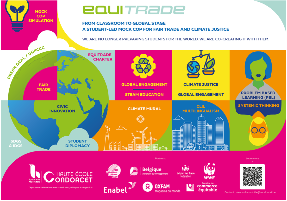 Le programme EquiTrade 2025 est un programme porté par la Haute École Condorcet, campus de Charleroi pour le deuxième année consécutive. Il s’agit d’un programme d’activités qui sedéroule sur plusieurs semaines, de mi-septembre à mi-novembre 2025, conçus pour stimuler la réflexion et le débat autour des enjeux du commerce équitable. Au programme : conférences, débats, ateliers collaboratifs et simulations de négociations internationales, avec pour objectif de renforcer l’esprit critique des étudiants et de nourrir leur engagement.