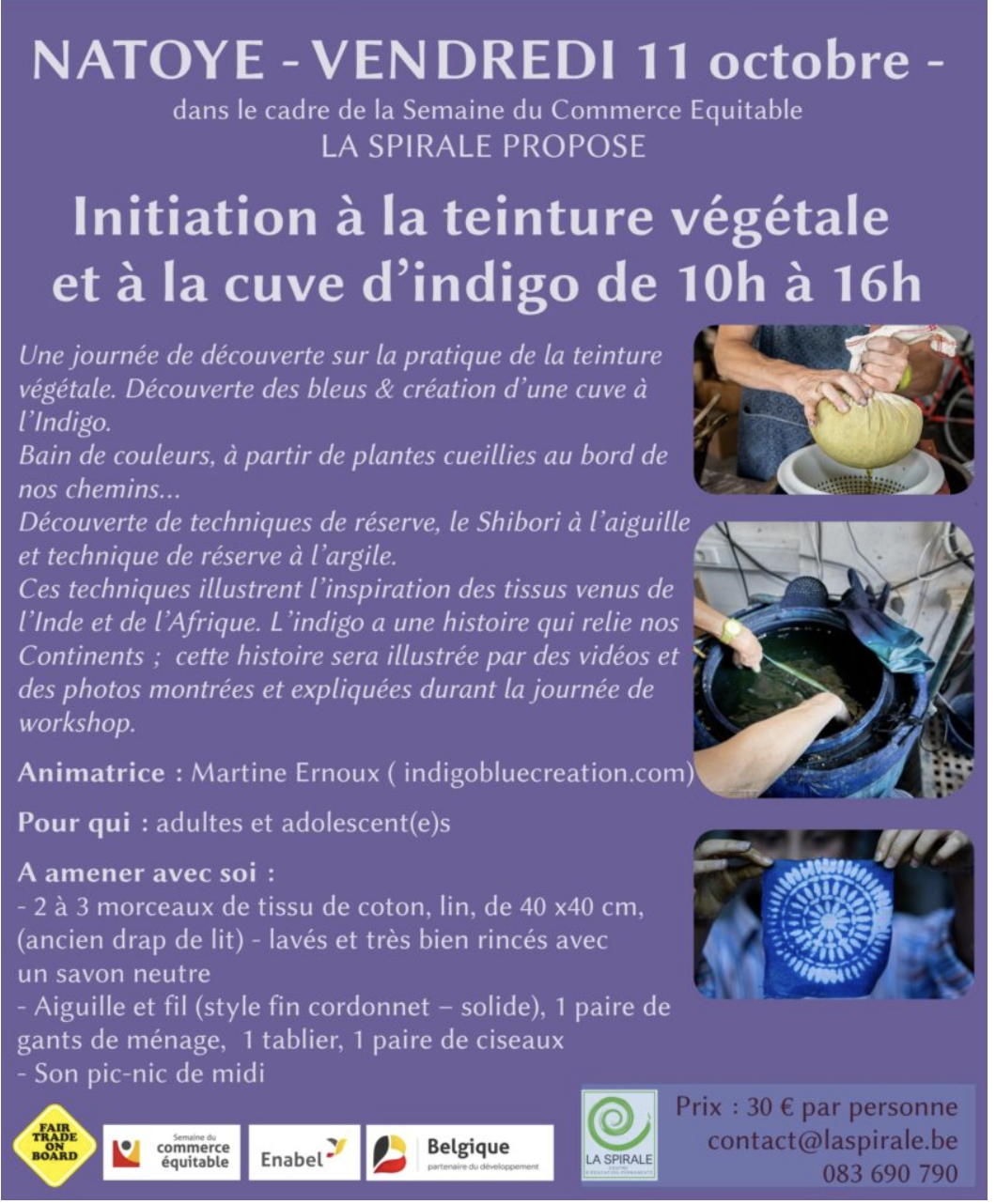 Atelier sur la teinture indigo (pour adolescent.e.s et adultes) et confection de pochettes/tote bags à partir de tissus récupérés, avec Martine Ernoux (Satya Pure Elements), sensibilisation au marché du coton et aux vêtements éthiques. Puis partage d’un goûter/débat autour de la consommation textile avec l’ASBl « Trame » de Namur.